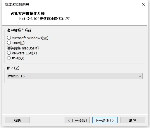 4 选择客户机操作系统,选择Apple macOS(M),版本选择macOS 15