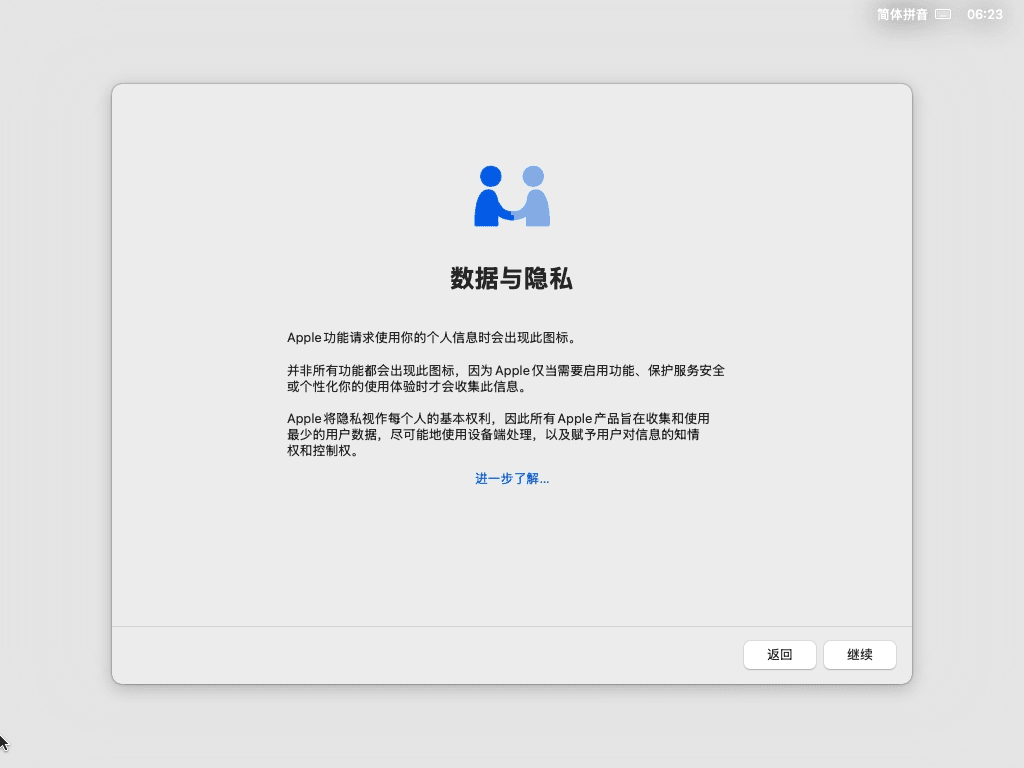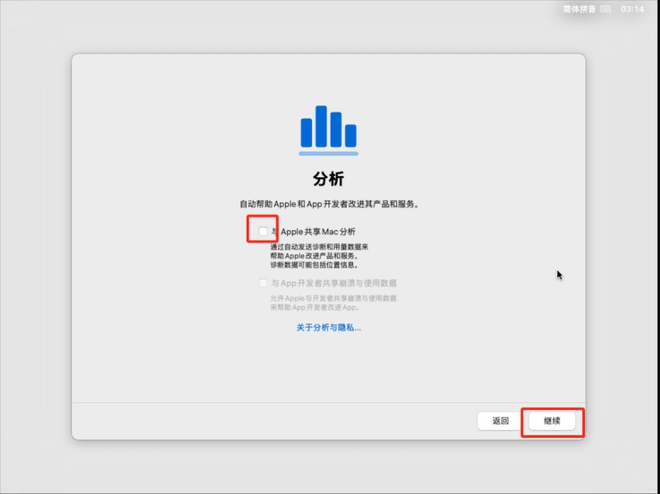 20 分析功能,建议取消勾选“与Apple共享Mac分析”选项,然后点击“继续”按钮