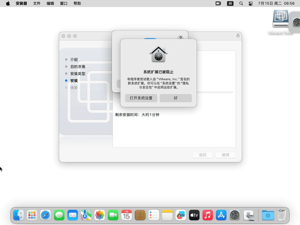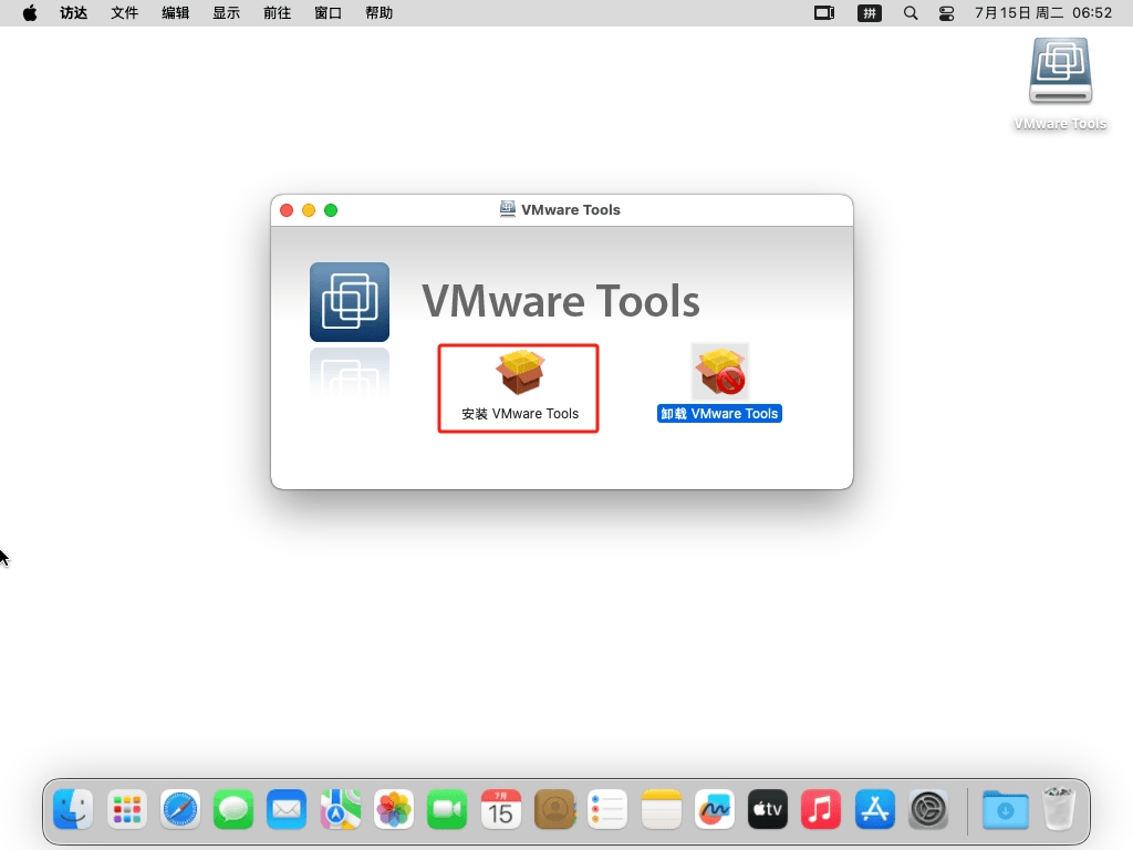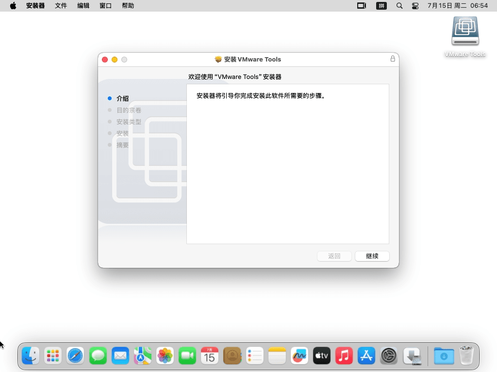 3 现在再次启动虚拟机,进入macOS之后,发现桌面右上角已经加载了“VMware Tools”了,双击打开它,再双击“安装VMware Tools”按钮就可以启动安装向导了,第一个界面就点击“继续”按钮。