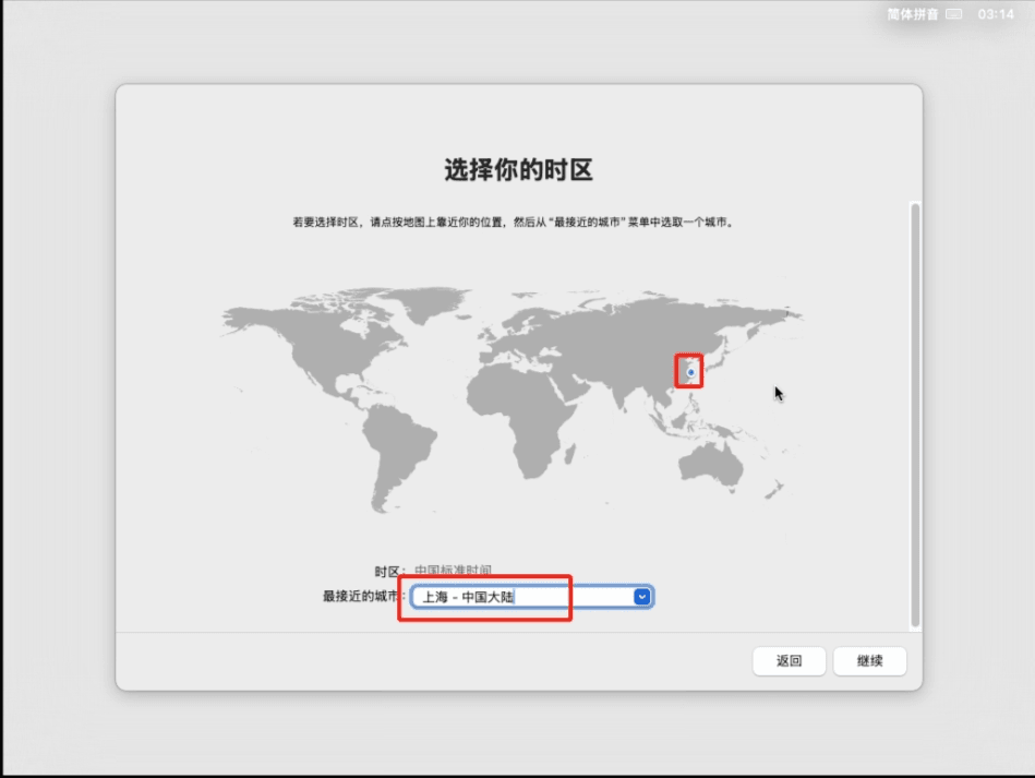 19 选择时区,你可以用鼠标点击那个地图,比如我这里点击了上海,时区会影响时间的显示,所以得选对了(当然后面我也会讲如何修改时区)