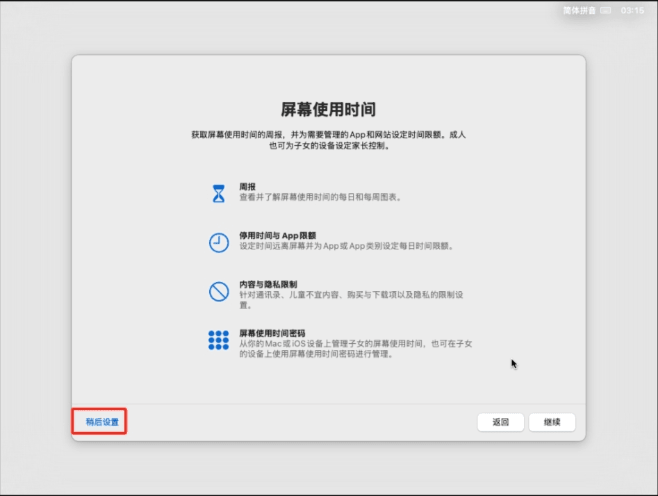 21 屏幕使用时间,为了节省性能资源,建议先不要开启,直接点击“稍后设置”按钮