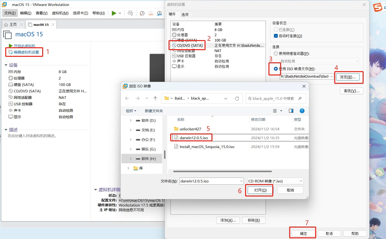 2 完全关机之后点击“编辑虚拟机设置”按钮,又回到自定义硬件的界面了,还是点击“CD/DVD (SATA)”选项,这次要把ISO镜像改为“darwin12.0.5.iso”这个文件了(可以参考我的截图),别忘了点击“确定”按钮。